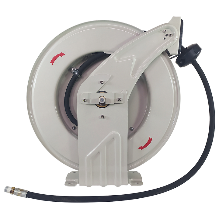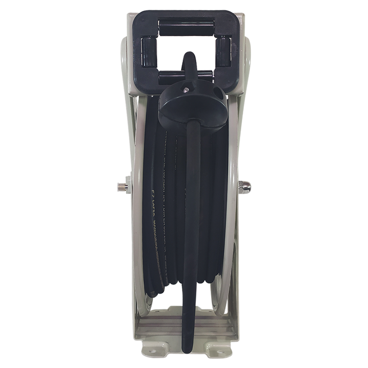 Este carretel em aço é amplamente utilizado para graxa, óleo, água e ar comprimido. É forte e robusto, porém compacto o suficiente para caber nos espaços mais apertados. Possui um suporte resistente com dois braços de cada lado para maior segurança, além de 4 pontos de fixação que permitem montagem nas posições horizontal e vertical, garantindo a liberação da mangueira na posição ideal.