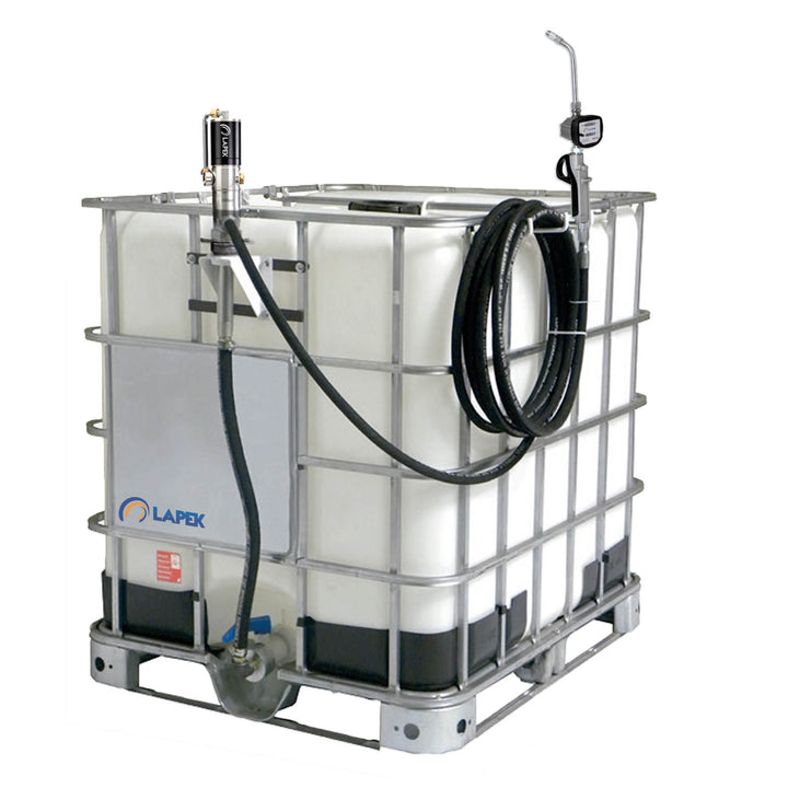 Reservatório em polietileno e porta-palete em aço (IBC), com propulsora pneumática fixada no reservatório por suporte em aço, filtro regulador de ar, medidor mecânico LPK-11100, suporte para medidor e mangueira. Entregamos para todo Brasil!